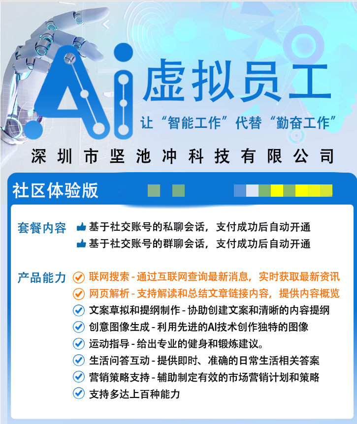 深圳市坚池冲科技有限公司推出的AI虚拟员工项目,由郑立鹏老师亲自掌舵,旨在打破传统“勤奋工作”的桎梏,以“智能工作”为核心,为个人与企业提供高效、安全、可定制的AI服务解决方案。该项目依托前沿AI技术,构建多场景服务体系,为用户开启智能化办公与生活的全新路径。