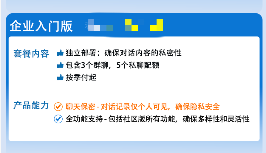 针对中小微企业的隐私与安全需求,企业入门版提供独立部署服务,确保对话内容的私密性。套餐包含多组群聊与私聊配额,支持聊天保密功能,对话记录仅个人可见,同时完整覆盖社区版的所有功能,帮助企业在低成本投入下,实现AI工具的安全落地与高效应用。