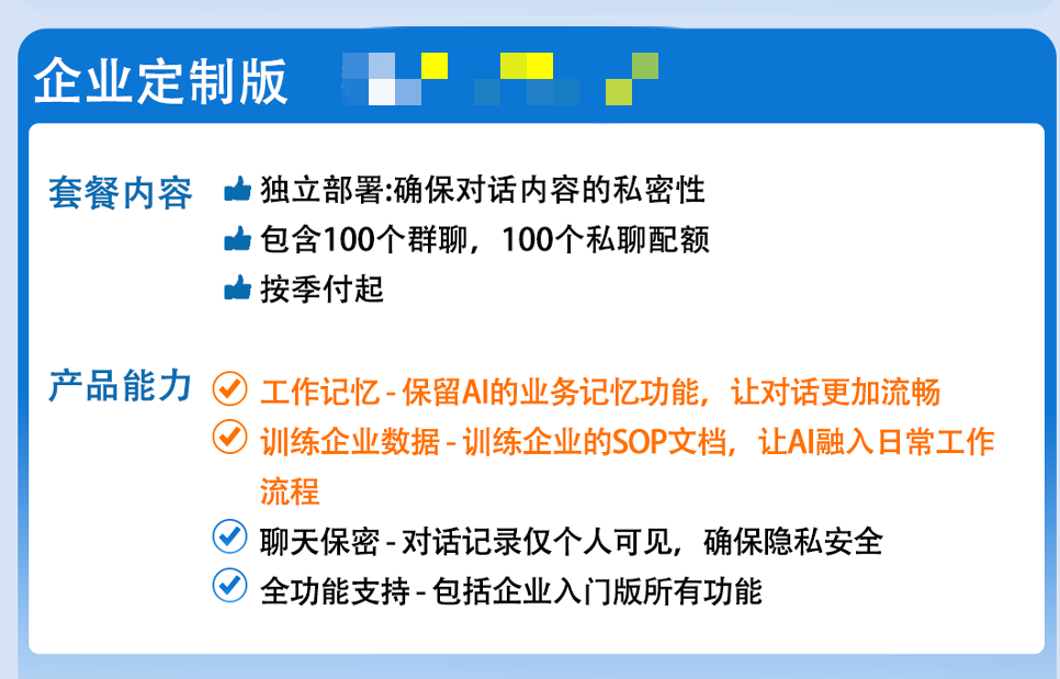 面向中大型企业的企业定制版,提供大规模群聊与私聊配额,支持独立部署与数据安全防护。该版本新增工作记忆与企业数据训练功能,可基于企业SOP文档训练专属模型,让AI深度融入日常工作流程,同时保留全功能支持与聊天保密特性,满足企业的深度定制化需求。