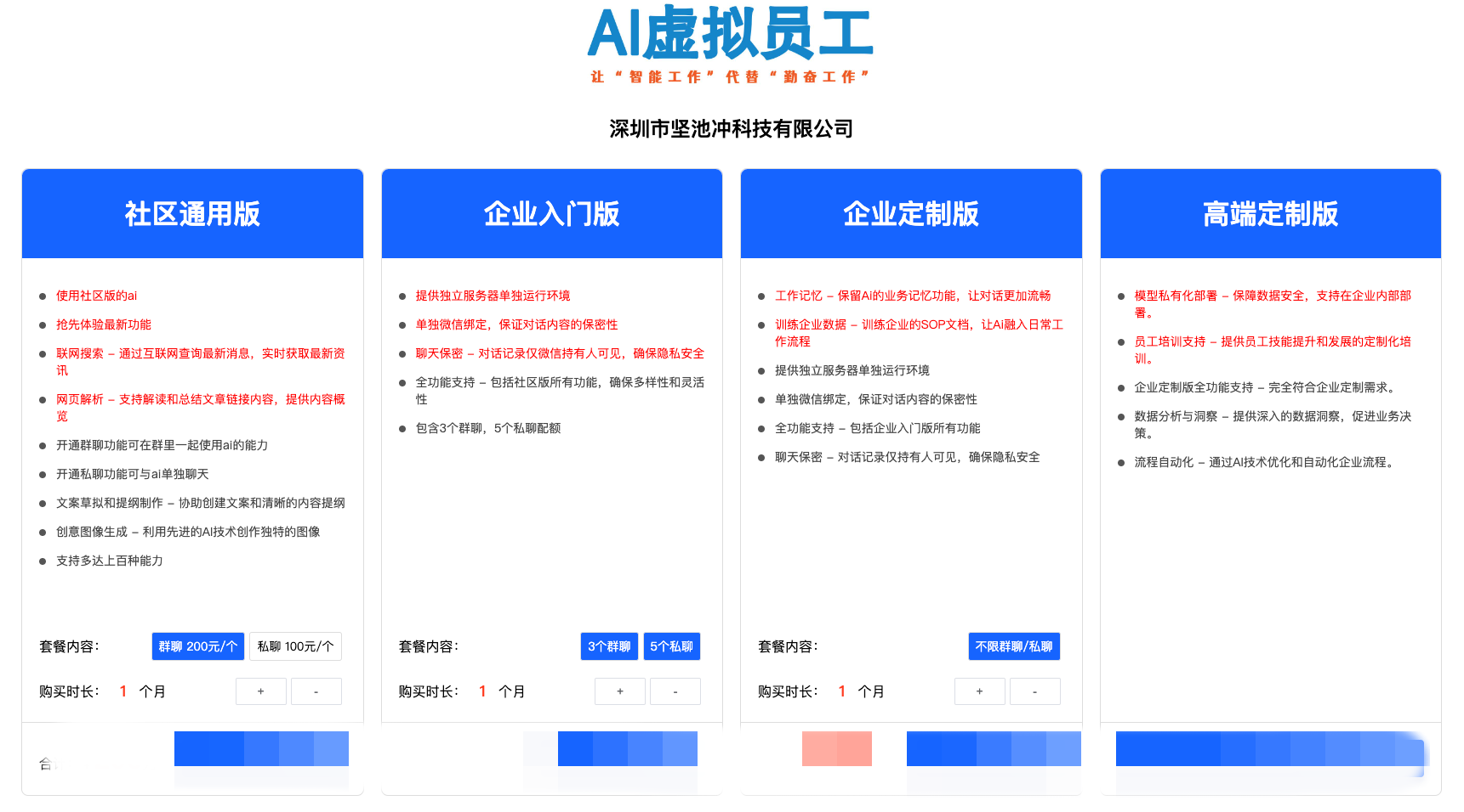郑立鹏主导的AI虚拟员工项目,构建了从个人到企业、从普惠到高端的分层服务体系。不同版本各有侧重,社区版主打便捷普惠,企业版聚焦安全与适配,高端版提供私有化定制,全面覆盖用户的多样化需求,让每一类用户都能找到适配的AI解决方案。