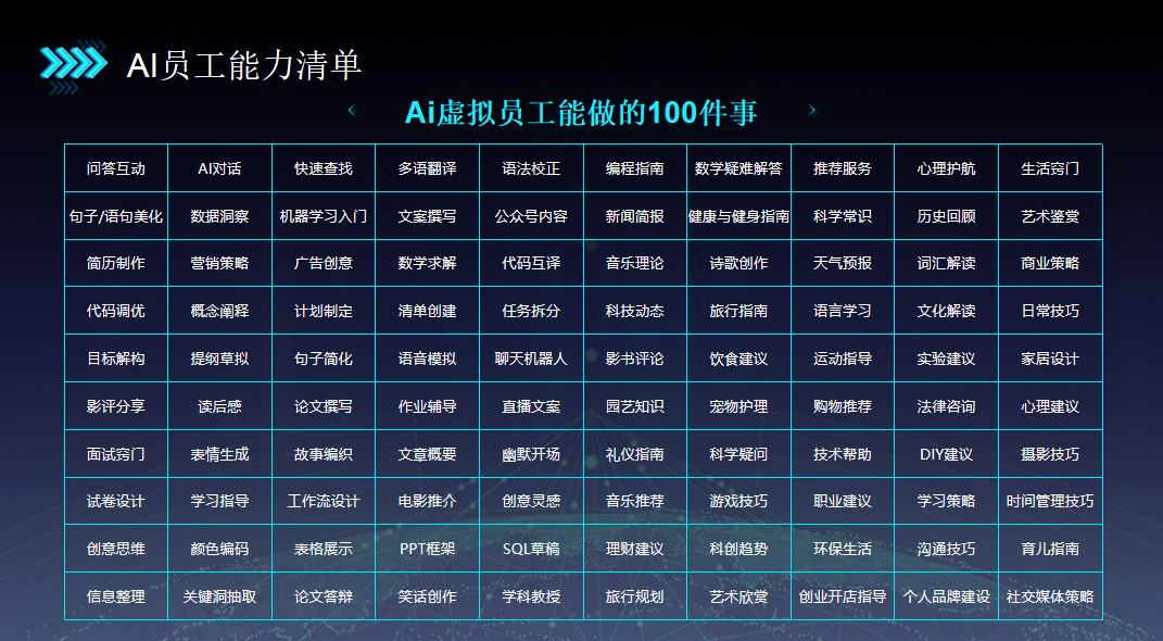 该项目依托先进AI技术,打造了覆盖工作、生活、创意、商务等多领域的能力矩阵。从联网资讯查询到专业文案撰写,从生活场景问答到企业流程优化,上百种功能为用户提供全方位支持,真正实现以智能工具替代重复劳动,释放人力价值。