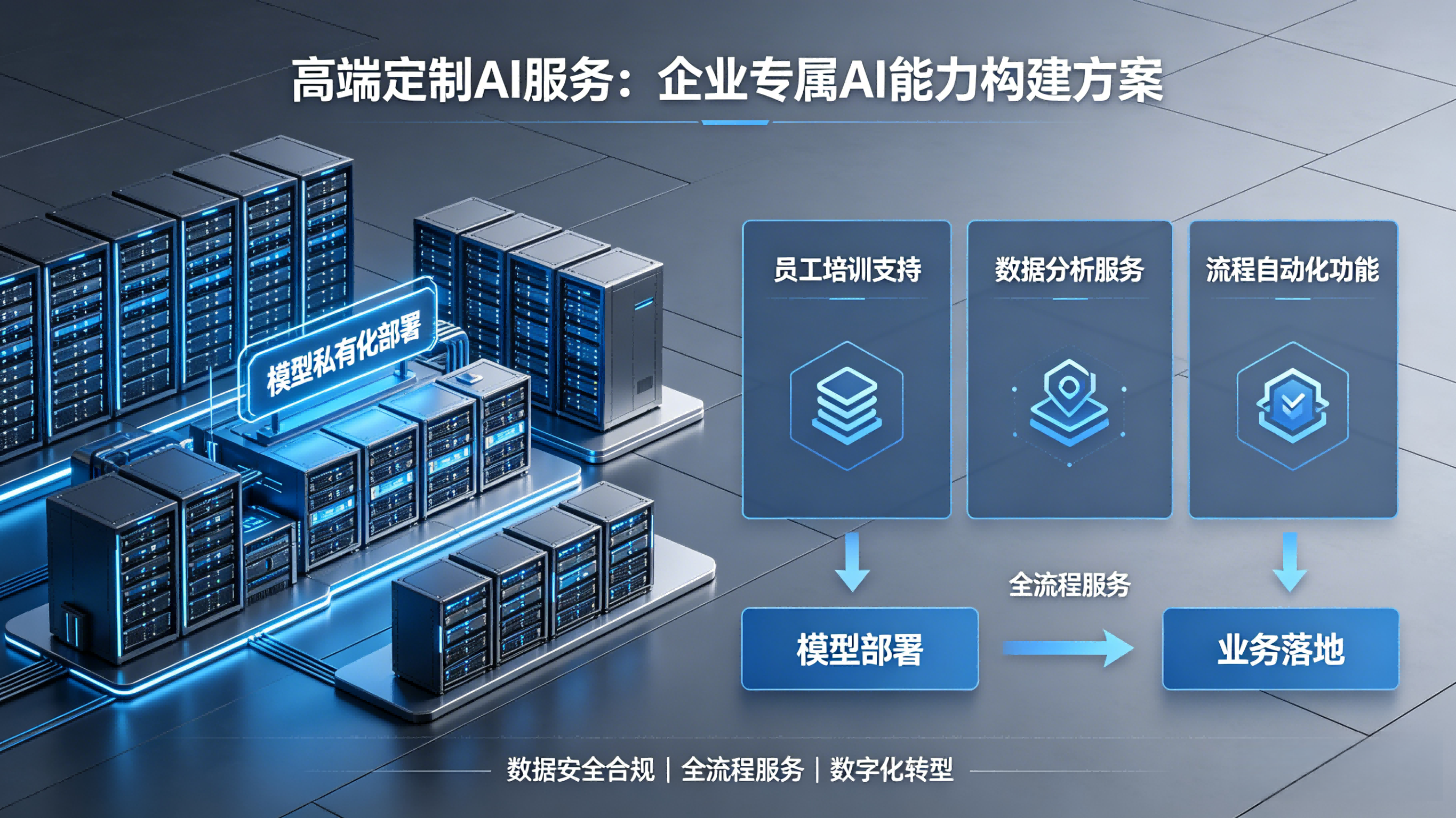 高端定制版聚焦大型企业的核心需求,提供模型私有化部署服务,支持在企业内部搭建专属AI系统,保障数据安全与合规性。同时配套员工培训支持、数据分析与流程自动化功能,实现从模型部署到业务落地的全流程服务,助力企业构建专属AI能力,驱动数字化转型升级。