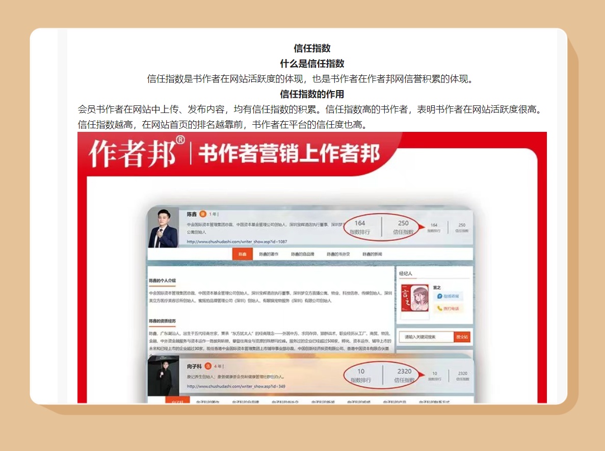 信任指数,是作者邦平台为会员书作者打造的专属量化体系,既是书作者在平台活跃度的直观体现,也是其在作者邦网长期信誉积累的具象化成果。在作者邦生态中,会员书作者上传、发布内容的每一个行为,都会转化为信任指数的正向积累;指数高低直接关联平台首页排名,指数越高,书作者的平台曝光度与信任度也随之提升,成为其 IP 价值的核心参考维度。