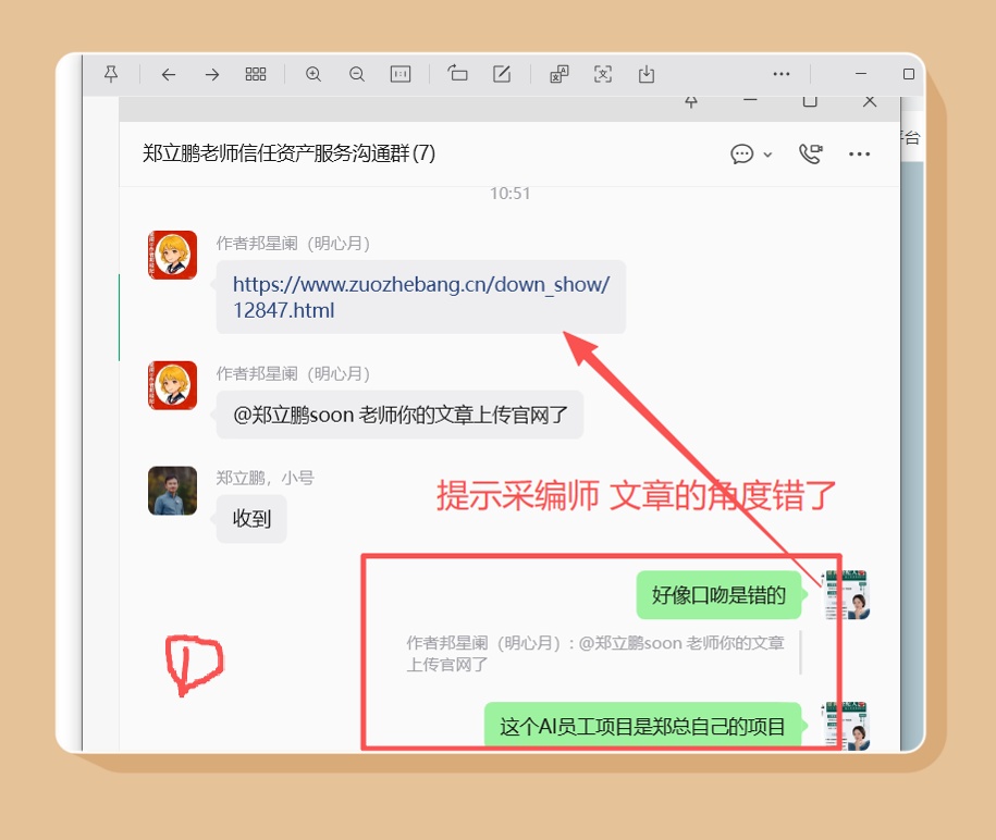 在为郑立鹏老师打造信任资产的服务过程中,采编环节的细节把控成为关键。针对郑立鹏老师的 AI 员工项目宣传文章,吴艳老师敏锐发现首版文案的口吻偏差,第一时间提示采编师修正方向,明确项目归属主体,避免因表述误差影响书作者的专业形象。这种对细节的极致敏感,正是信任指数积累过程中不可或缺的严谨态度。