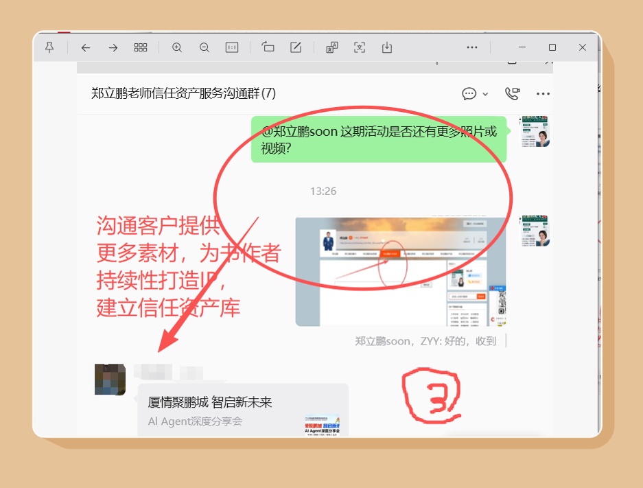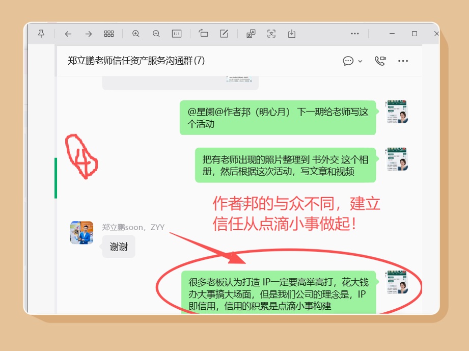 为实现信任指数的长效增长,作者邦吴艳老师主动向客户索要活动照片、视频等素材,提出将相关素材整理至 “书外交” 相册,并围绕活动持续产出文章与视频内容。通过系统性收集客户动态素材,为书作者搭建专属信任资产库,让 IP 运营有持续的内容支撑,为信任指数的稳步提升筑牢基础。