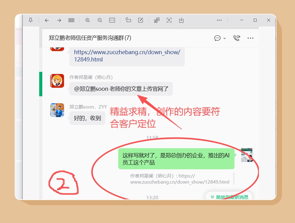 修正方向后的内容创作,更需紧扣客户定位精益求精。吴艳老师重新梳理郑立鹏老师的 IP 定位,将 AI 员工项目的表述调整为 “郑总创办的企业推出的产品”,确保内容与客户身份、业务场景高度契合。作者邦始终坚持,每一篇为书作者创作的内容,都要精准匹配其个人定位与品牌调性,才能真正为信任指数的正向增长赋能。