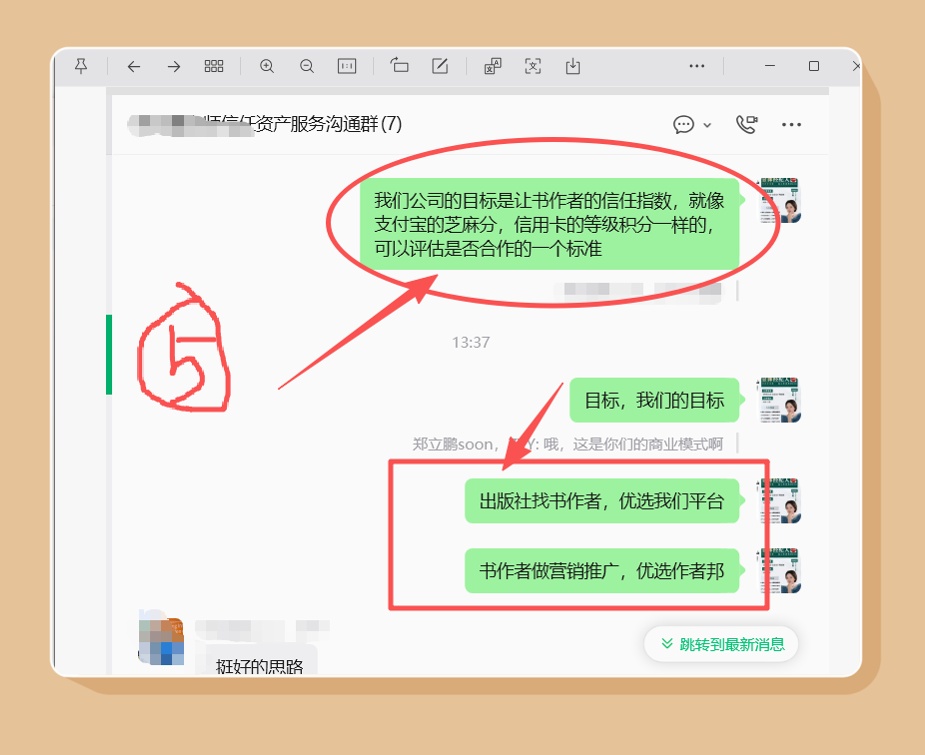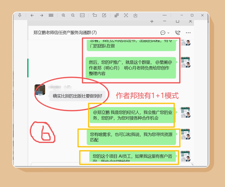 吴艳老师的客户对接工作,正是作者邦信任指数生态的重要一环。通过群内对接客户、传递作者邦服务理念,吴艳老师既帮助客户理解信任指数的价值,也为平台引入更多优质书作者资源;客户在对接过程中,通过作者邦的专业服务实现信任指数的提升,进而反哺商业合作,形成 “客户对接 — 指数增长 — 商业落地” 的良性循环,让信任指数真正成为书作者 IP 经营的核心动力。