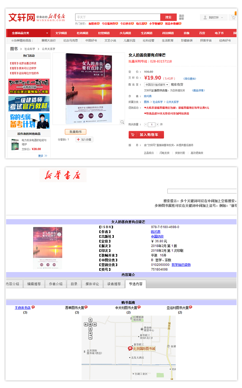 近日,《女人的善良 要有点锋芒》一书的火爆热销状态得到延续,在出书大师和陈巧燕老师的不懈努力下,此书同步登陆新华书店线上商城和线下实体店,将会与更多的读者粉丝见面。