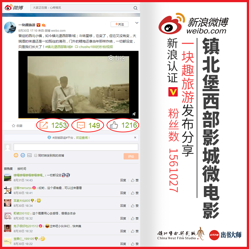 这部微电影的上线,受到诸多自媒体的广泛关注。出书大师网作为张公辅先生的重要合作伙伴,也加入了如火如荼的推广宣传工作。近日,出书大师旗下网媒公司重要合作伙伴,id名为“一块趣旅游”的著名微博大V便在其微博主页上分享发布了此条影片,受到诸多网友的热烈追捧。