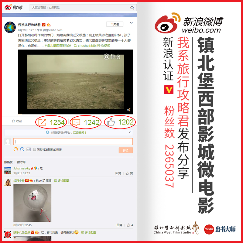 (福州云轩文化讯)近日,由镇北堡西部影城董事长、出书大师网自品牌VIP 合作伙伴米高猫先生自编自导的微电影——《镇北堡西部影视城》正式推出。出书大师网旗下网媒公司重要合作伙伴,id名为“我系旅行攻略君”的著名微博大V在其微博主页上分享发布了此条影片,短短的时间内就吸引了大量网友围观,截止目前,该片点击量已超过了70万次。