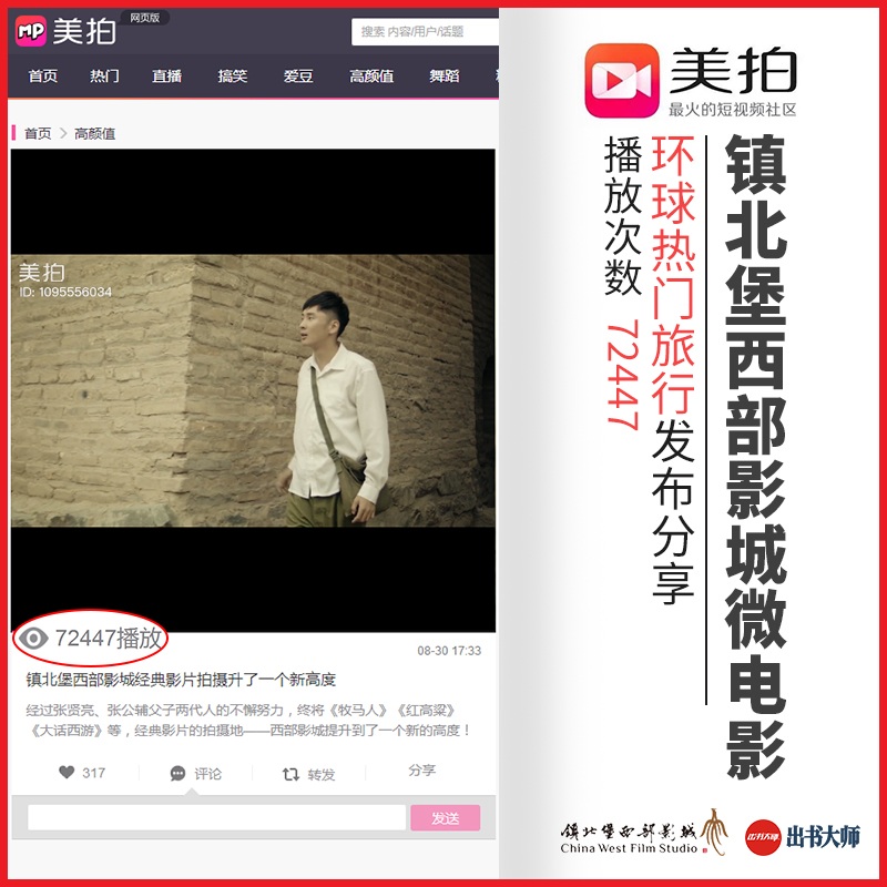 近日,出书大师旗下网媒公司重要合作伙伴知名美拍大佬“环球热门旅行”分享发布了米高猫老师自编自导的《镇北堡西部影视城微电影》,引起了诸多网友的广泛关注。短短时间之内这部微电影就被网友们不断的分享传播,播放量很快就突破了7万,场面一度十分火爆。