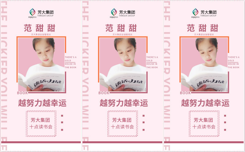 自从加入芳大,老大每天对她一对一指导,教她专业知识以及如何管理团队等等。后来,随着时间的推移,她还认识了技术部的前辈,性格超级好的前辈和热心的老大一样乐于助人,手把手教她做视频、做课件……来芳大的短短几个月,范甜甜就学到了以前在工作岗位上从来不曾接触的东西,她感觉到自己在飞速成长着。特别是在读到由芳大集团董事长吴小芳联合芳大集团执行董事长吴利元倾力打造的巨著《谈话的力量》这本书时,范甜甜被深深的吸引了,醍醐灌顶,决定把语言的力量充分发挥到日常工作中。