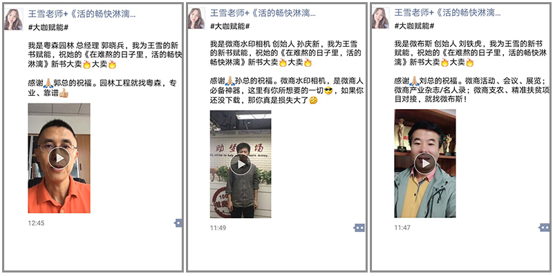 这本书自从面世以来,就受到了业内外的一致好评。许多业内大咖都纷纷向王雪老师送上祝福。著名的粤森园林总经理郭晓兵,微商水印相机创始人孙庆新,微布斯创始人刘铁虎,零零显示科技创始人李硕,卡门大酒庄掌门人朱劲,落地荟联合发起人吴猛等诸多业界知名人士都对王雪老师的作品表示赞赏,并且祝愿王雪老师的著作能够取得很好的销售业绩。