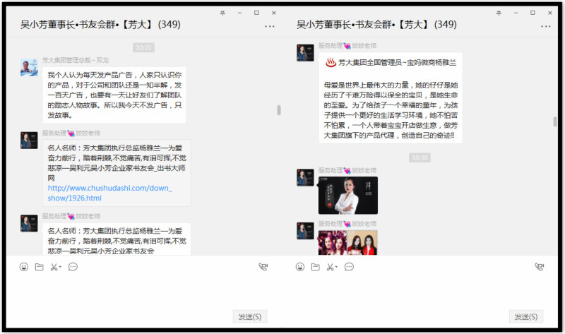 (名人名师讯)我们今天不说芳大集团的产品,我们来说说芳大集团那一群有爱,励志,有故事的芳大人。芳大集团的吴小芳董事长的书友会群里都是一群有爱的芳大人,她们都是因为结缘芳大,而让自己的人生产生了一系列的变化,我们来看看她们的互动。