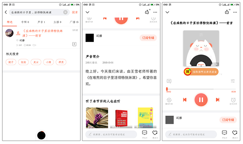 如今这本《在难熬的日子里,活得畅快淋漓》已在喜马拉雅平台上线,读书音频由名人名师读书会部长江南负责录制,江南部长现就读于复旦大学,是喜马拉雅FM网红。希望广大读者在看了此书以后,能收获到书中所想要传达的一种处世智慧,“一蓑烟雨任平生。归去,也无风雨也无晴。”的无畏与豁达。
