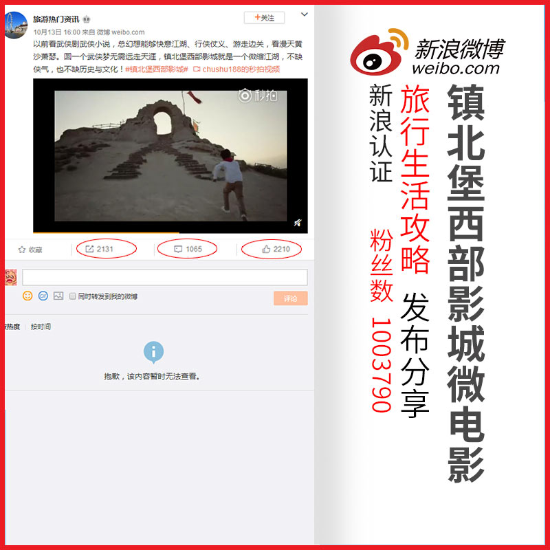 米高猫老师是出书大师VIP合作伙伴,近日,米高猫老师编导的“镇北堡西部影城微电影”引发了无数网友的遐想。出书大师旗下网媒合作伙伴,新浪百万粉丝博主“旅行生活攻略”分享之后,迅速有了1065条评论,转发和点赞量迅速达到2131和2210,得到了广泛的传播和热烈的讨论。