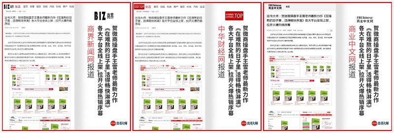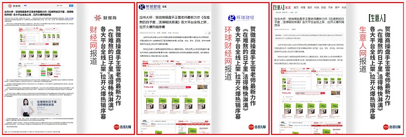出书大师网旗下重要网媒合作伙伴财经网、环球财经、生意人网、商界新闻网、中华财经网、商业中文网等权威媒体对《在难熬的日子里,活得畅快淋漓》一书全线上架的新闻进行了广泛报道以及后续的一个全网推广宣传。诸多读者在看到此条新闻之后,都表示出了极大的阅读兴趣,他们纷纷翘首以待,渴望这本书籍能够为身处挫折的他们,带来鼓舞人心的力量。