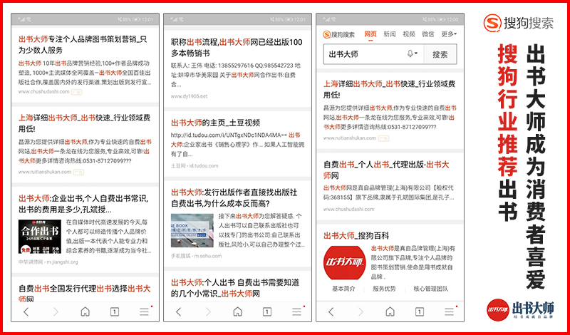 除此之外,出书大师也在不断的开辟网络推广新渠道。搜狗作为另一个我国主流的搜索引擎。