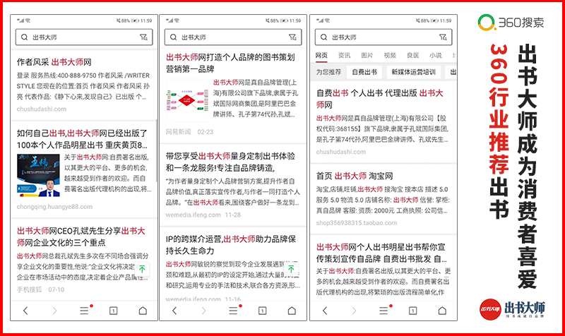 出书大师不断助力个人品牌霸屏360官网首页,更合作360广告推广系统、全面、持久地打造良好的网络口碑,建立起更好的品牌效应。