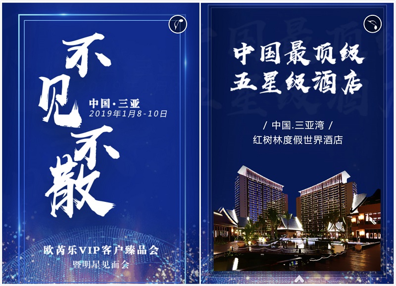 “O’RIE 殴芮乐VIP客户臻品会暨明星见面会”将会在中国三亚湾红树林度假世界酒店举办。红树林度假世界酒店位于享有“椰梦长廊”美誉的海南三亚湾,是一家巨无霸式五星度假酒店,具有71家主题餐厅,与会人员将奢华享受价值4800元的三天两夜豪华假期。