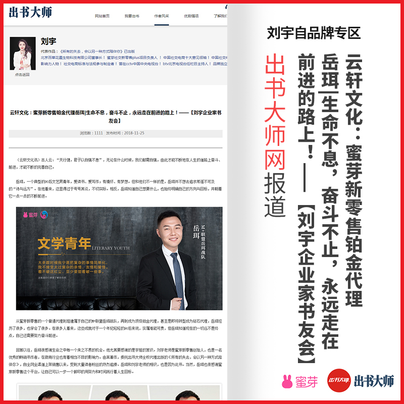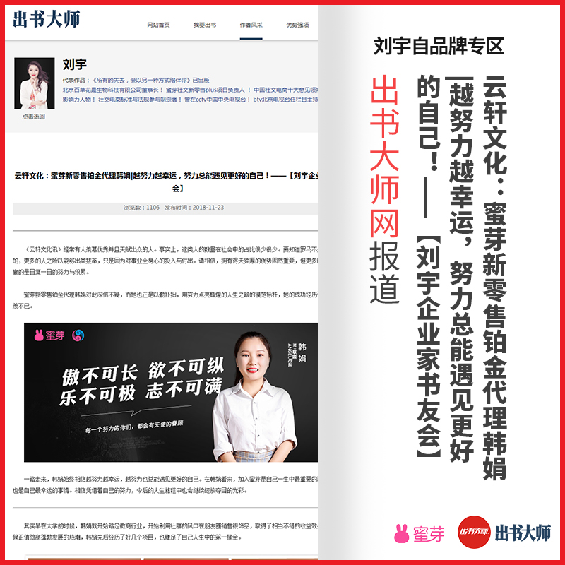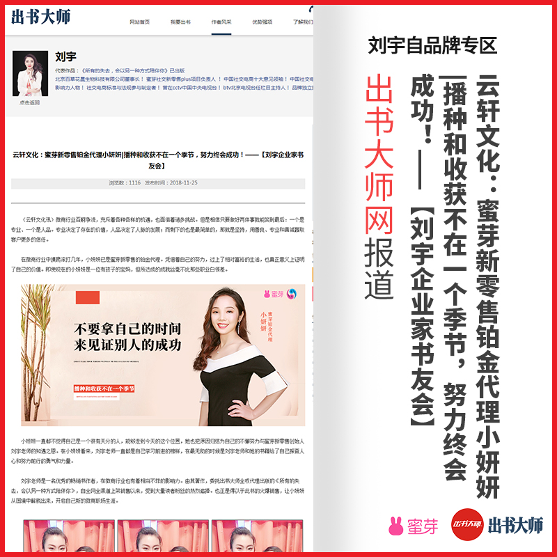 祝愿刘宇老师的蜜芽团队不断壮大,出书大师网承诺为刘宇老师品牌形象的传播贡献更多力量!