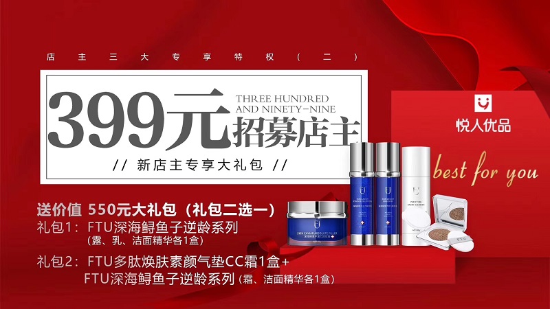 1、新店主大礼包二选一,礼包一:FTU深海鲟鱼子逆龄系列(露、乳、洁面精华各一盒),礼包二:FTU多肽焕肤素颜气垫CC霜各一盒+FTU深海鲟鱼子逆龄系列(露、洁面精华各一盒)