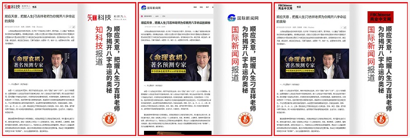 作为出书大师网的自品牌vip合作伙伴,刁吉祥老师的对于命理学诠释的新闻被今日中国、国内新闻网、华商在线、知科技、国际新闻网、亚联社、商业新闻网、新华商讯等诸多网络媒体进行了联合报道,占据了各大版面头条,带来了庞大的流量冲击。