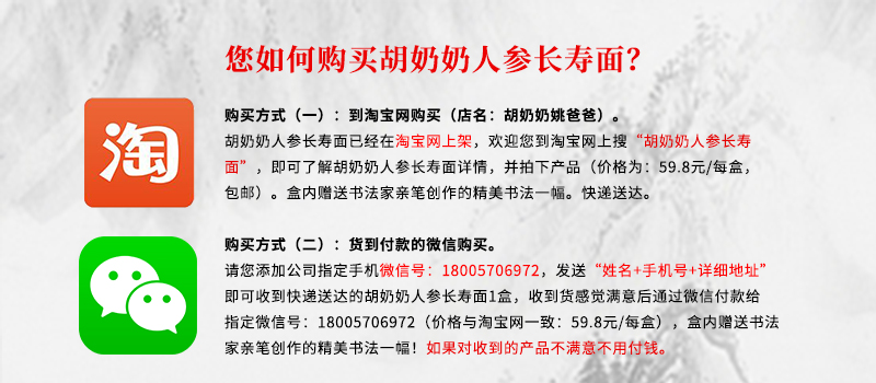 请您添加公司指定手机微信号:18005706972,发送“姓名+手机号+详细地址”即可收到快递送达的胡奶奶人参长寿面1盒,收到货感觉满意后通过微信付款给指定微信号:18005706972(价格与淘宝网一致:59.8元/每盒),盒内赠送书法家亲笔创作的精美书法一幅!如果对收到的产品不满意不用付钱。