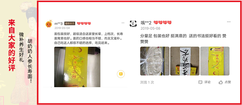 小编吃饱面喝足汤,打开手机淘宝,毫不犹豫地给远方的爸妈、外公外婆、爷爷奶奶分别拍下了胡奶奶人参长寿面礼盒,一边拍一边想象着长辈们快乐吃面、浑身舒坦的镜头。啊,小编灵感忽至、写诗为赞:“益智又健体,养生选好礼!一碗人参面,浓浓表心意!”
