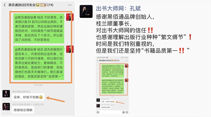 近日,黑百通品牌创始人桂兰顺女士对出书大师网专注质量的态度予以充分的理解。由于桂兰顺女士的书籍封面是本人照片,代表了企业以及数十万代理商的整体形象,因此出书大师网对此十分重视,前后优化十余次力争做到精益求精。虽然原定的计划时间有所延期,但相对于速度而言,质量才更为重要。