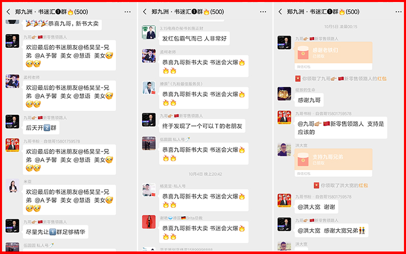 加入九哥微信书迷汇的书友来自全国各地各行各业,年龄层次跨度也很大,从70后、80后、90后到95后还有00后,这些书友身份也各不相同,有很多是来自不同行业不同品牌的管理者,有著名品牌中国区合伙人、营销总裁、社交电商行业意见领袖,甚至还有在校大学生、时尚辣妈……,大家共同组建成九哥书友汇大家庭,在这里九哥有问必答,为了更好地回馈大家,他将99元二本畅销书包邮到家,还附送亲笔签名,很多人得知消息后又加入新一轮的抢购热潮。