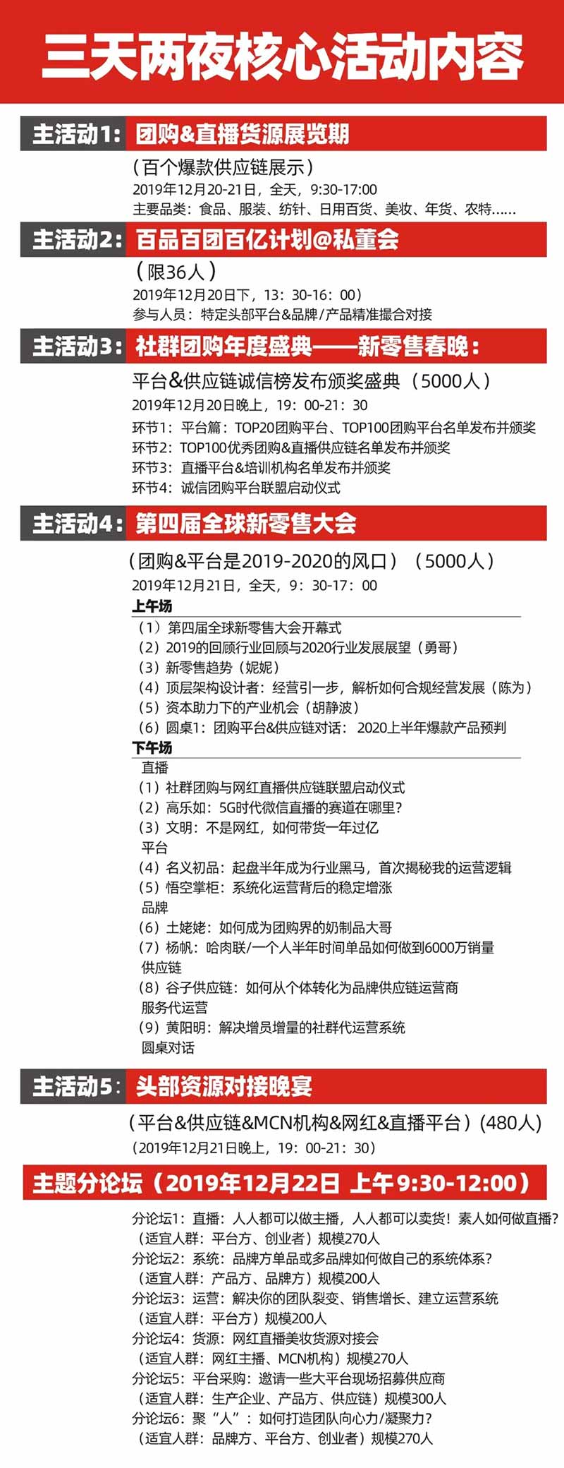 2019 连续 6 场的千人大型活动,很多伙伴一路跟随,很多人反馈,我们活动效果非常好, 质量非常高,他们不愿错过任何一个环节。但因为活动内容安排的太满,导致他们如果学习 了就选不了品,选了品就错过了学习。所以我们年底的社群团购年度盛典进行了时间分离, 重构了活动安排,拉长了时间。并且针对不同的人群,进行了不同的内容布局。