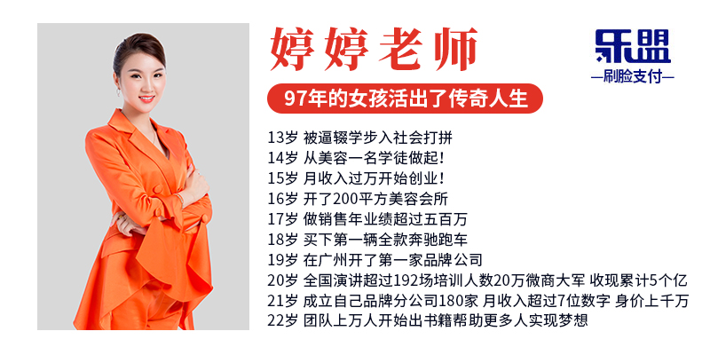 今年,二十二岁的她,发起了乐盟刷脸支付项目,项目对于客户、服务商、商家的益处正吸引着越来越多的人们参与进来。她的万人团队也开始著书立作,力争帮助更多的创业者指引一条发展明路。