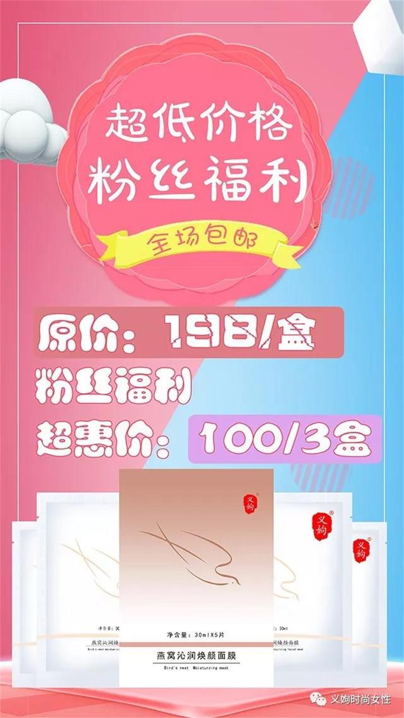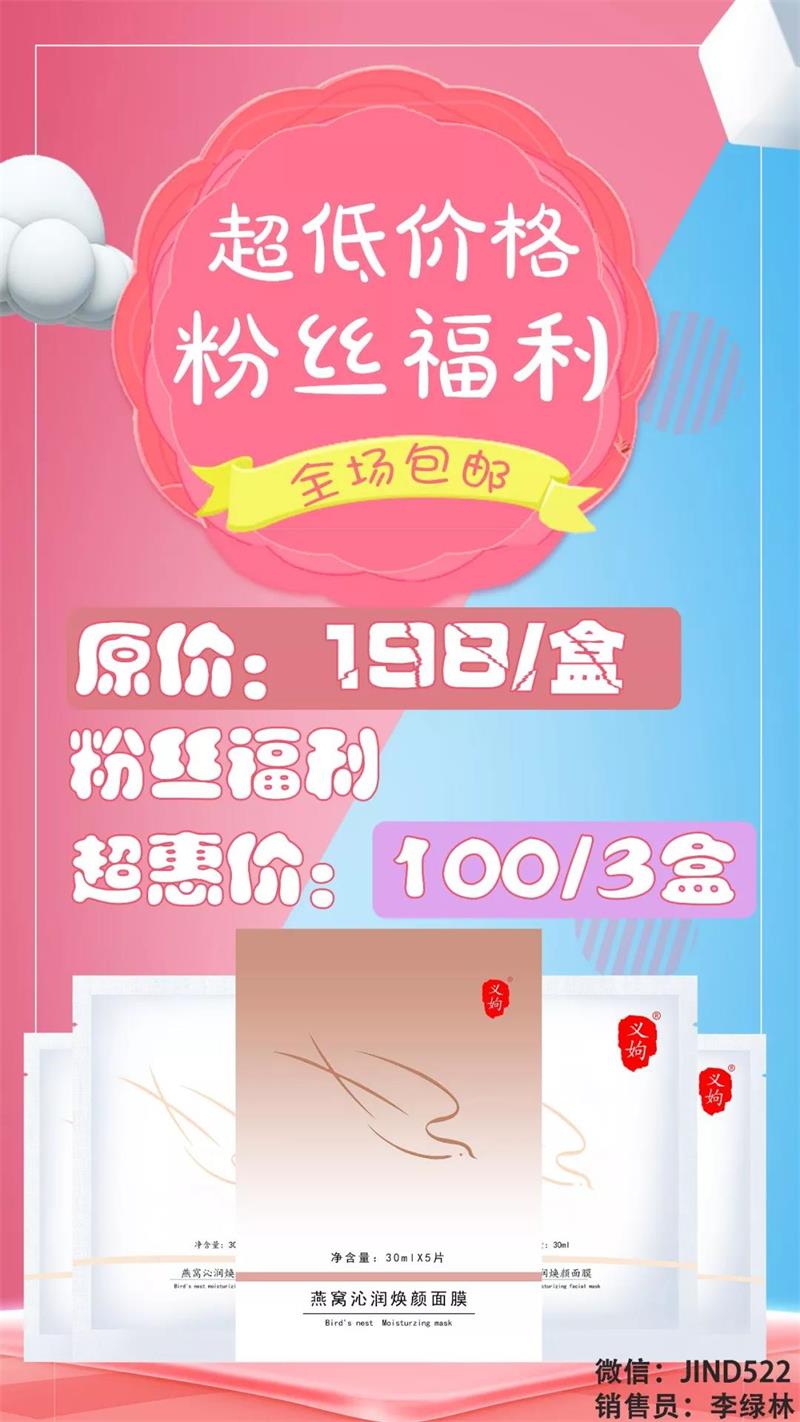 义姁燕窝焕颜补水面膜平时是198元1盒,现在为了做一下市场口碑100元就可以拿走3盒,我今天就抢购了9盒,大家赶紧去加一下微信JIND522抢够哦!!!