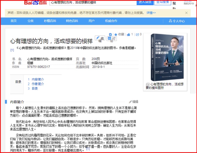 众所周知,百科是一部有着平等、协作、分享、自由理念的网络百科全书,致力于为每一个互联网用户创造一个涵盖所有领域知识、服务的中文知识性平台。而深受大众欢迎的百度、360、互动三家百科平台也有着近乎严苛的审核标准,通俗而言,只有真正贴近真理、真正被大众认可的书籍才能成功被三家百科认可。
