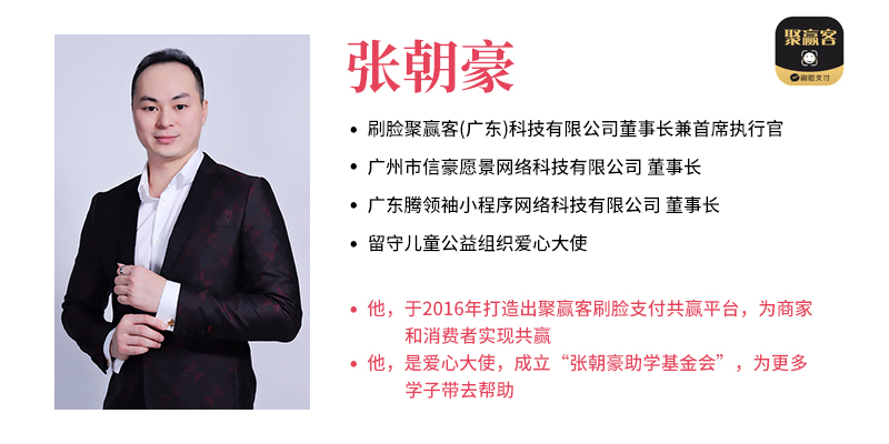 张朝豪创立的刷脸聚赢客(广东)科技有限公司是一家集团型产业链公司,成立于2016年,是国内最早一批微信开发服务商,是020移动营销和移动支付落地推广商,首批微信支付、支付宝、百度钱包、京东钱包、银联支付官方合作伙伴,在国内享有很高的美誉。 凭借着强大的技术体系,丰富的产品功能,超前的UI设计,—流的创新能力嬴得了业界的—致好评。旗下设有软件开发业务、多元型O2O商学院、 线上综合商城、创业基金等四大核心业务。