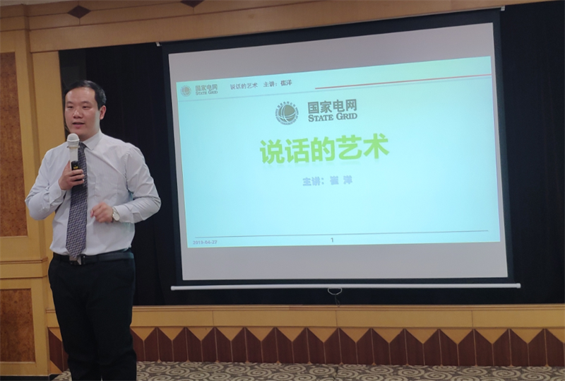 在国家电网的培训室,崔洋老师用生活中常常发生的案例为学员讲述把话说好的方法和技巧,约50位学员被崔洋老师生动而又实用的讲解所感染,对《说话的艺术》产生了强烈的兴趣。就像崔洋老师所讲的:“一个人的成功,仅仅有15%取决于专业知识和技术,而其余85%则取决于口才艺术。”口才是思想的外壳,是与人沟通的桥梁。任何人际关系的处理都需要靠说话的技巧来协调,任何专业知识的发挥都需要靠说话的艺术来实现。