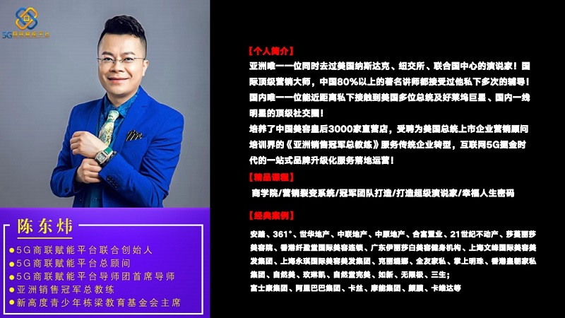 陈东炜老师可以说是营销领域的传奇人物,早在2006年,陈东炜老师就开启了他的职业生涯。在几年的时间不断学习练习下,陈东炜一步步的成为了国际顶级的营销大师,打破了多项销售记录的他顾问费高达千万级别,美国多位总统、好莱坞巨星、国内一线明星顶级社交圈经常可以看到他的身影,因此,陈东炜也被誉为亚洲销售冠军总教练。