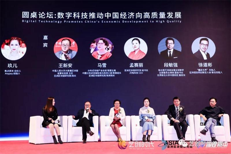 韩锋先生分享完毕之后,本场的第一轮圆桌会议以《数字科技推动中国经济向高质量发展》为主题,从数字经济,区块链未来投资方向,以及区块链新时代机遇这几个方面进行了讨论,焦点资本合伙人、Anypay创始人玖儿担任主持,中国人民大学大数据区块链监管实验室副主任,亚洲区块链研究院院长王新安、分布式存储产业投资联盟主席、中国分布式存储标准与检测小组联席组长、亚洲区块链研究院联席院长马雪、亚洲区块链研究院秘书长、闪电科技CEO孟赛丽、联合国可持续发展全球数字加密委员会常务副秘书长、世界联合大学中国校区副校长段敏强、徐道彬:“重启世界”创始人、区块链协同创新百人会联合发起人担任嘉宾。王新安主任在圆桌论坛中表示,数字经济确切来说不应该是中国经济弯道超车的机会,中国经济在数字经济中其实已经站在了起跑线的位置,虽然这条跑道目前参赛的选手不多,但中国是有实力直线加速夺得第一的。所以数字经济对于中国来说不存在弯道超车这一说。第一轮圆桌论坛在众嘉宾的激烈讨论中完美结束。