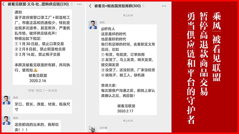 为了可以维护正常的市场秩序,同时保障供应链、平台以及消费者的多方权益,被看见联盟在创始人乘风老师的带领下,向联盟以及联盟涉及的杭州、长沙、义乌等各大团体,发出禁止口罩等高退款商品的交易。并且,为了防止高退款商品交易中会出现的退款率100%以上、缺货不退款等状况。同时,也为了防止这些行为严重扰乱市场、破坏供应链和平台名声;更为了防止可能出现的灭顶之灾。从1月30日起,禁止口罩交易;从2月8日起,禁止额温枪交易;从2月16日起,禁止瓶子交易。以便,可以让供应链、平台以及消费者等的利益免受损害。因为,只要不交易口罩、额温枪等高退款商品,就不会发生大面积的退款行为,从而能够保障到消费者的合法利益。