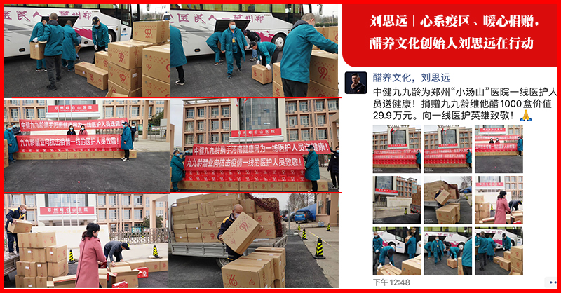 中健九九龄团队,也不例外。他们,在创始人刘思远老师的带领下,分别向疫区的一线医护人员送去了价值一百多万元的抗疫物资。其中,包括了向一线医护人员捐赠的价值150万元的九九龄维他醋以及向郑州“小汤山”医院捐赠的1000盒29.9万元的九九龄维他醋。