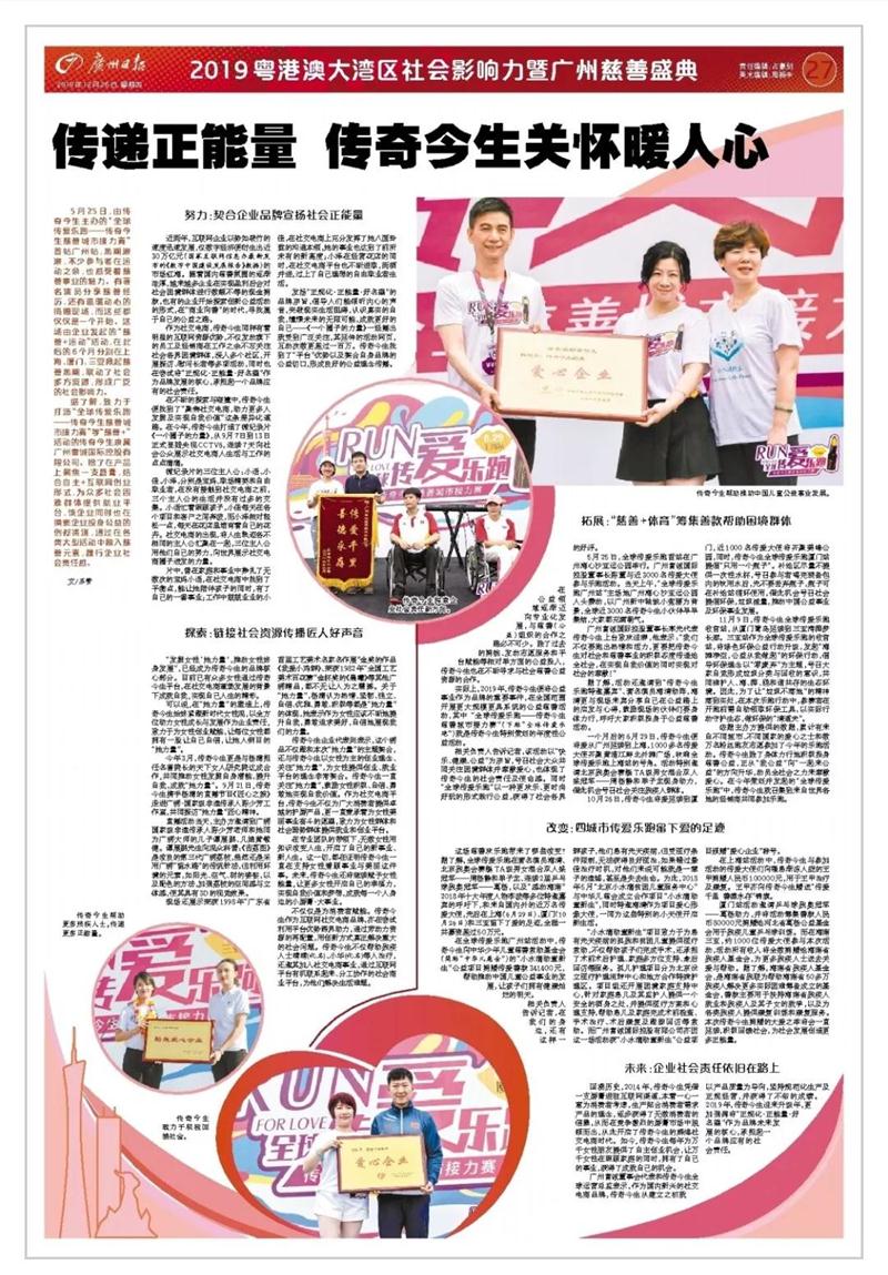 2019年,传奇今生更是将公益事业作为品牌的重要使命,在全国发起 “全球传爱乐跑——传奇今生慈善城市接力赛”,从广州到上海,从厦门到三亚,召社会大众共同关注弱势群体并奉献爱心,体现了传奇今生企业的社会责任及使命感,将爱心传递到社会各界,形成广泛的社会影响力。