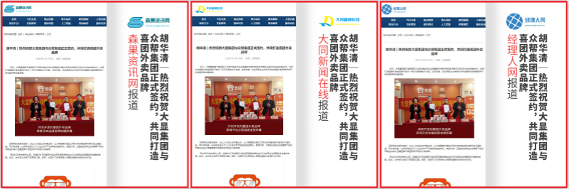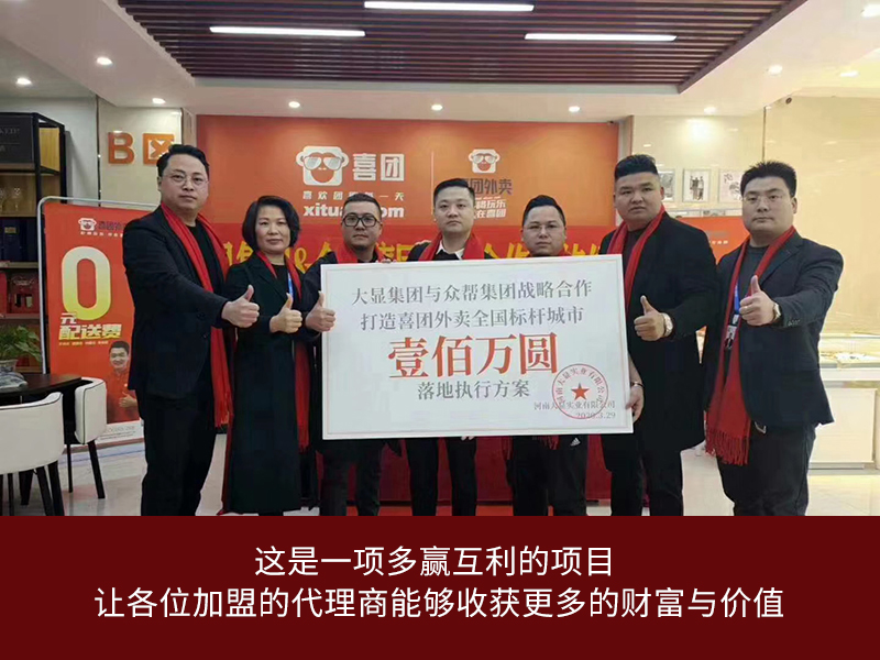 正式在这样的情形之下,大显集团联合众帮集团展开战略合作并正式签约,启动了喜团外卖全国标杆城市一百万元的落地执行方案。由此,启动了喜团外卖全国招商加盟的步伐。喜团外卖品牌,不仅零费用帮扶实体门店。而且,还在线上裂变工具、线上直播平台、线下7+1执行等方面实现零费用。同时,还为每座加盟的城市补贴百万元。