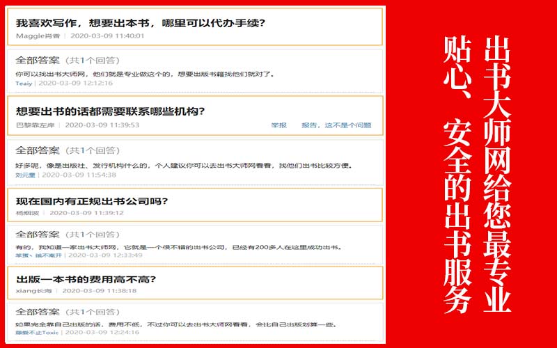 如今,只要网友们留心、关注或者搜索关于出书大师的关键词,互联网上便可以给大家呈现丰富而详尽的有关出书大师网方面的业务问答信息。这里面,包括了名人定制出书可以找哪里去获得相关的业务服务、如何出书比较容易等方面的业务问答信息。这些,都是出书大师网通过全网问答平台进行问答营销的极佳效果展现。