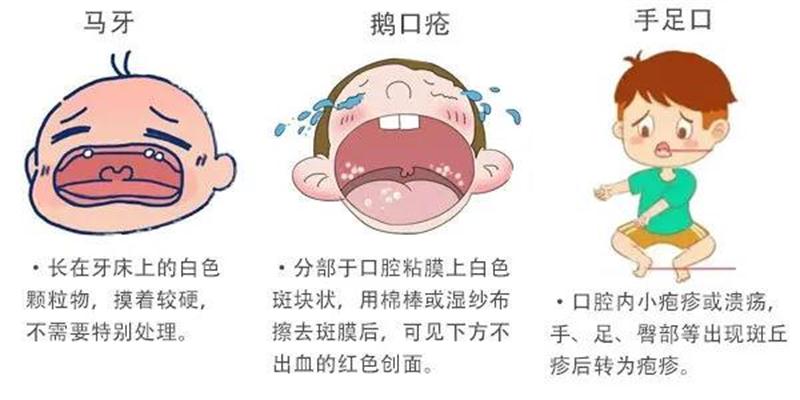 3. 注意和马牙的区分,马牙是长在牙床上的白色颗粒物,摸着较硬,不需要特别处理。鹅口疮较软,分布在口腔,需要清洁或治疗。