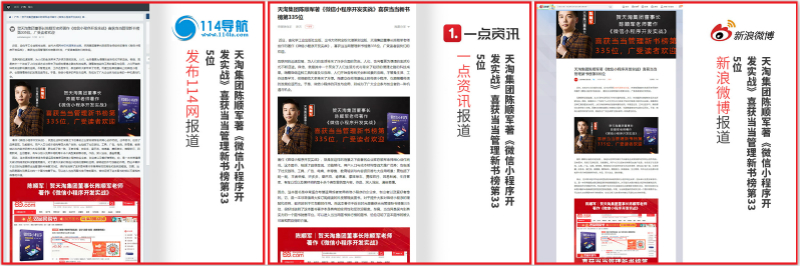因此,这本图书是非常适合希望运用或者使用微信小程序的企业家、创业者以及爱好者等的。它,是一本非常值得大家订购阅读的科技管理类图书。对于提升大家对微信小程序的理解和应用,都将起到不可忽略的作用。而这本著作于近日时光里喜获当当管理新书榜第335位,很好地说明了这本图书著作本身具有的实用性和受欢迎程度。毕竟,当当网是国内别具实力的一个图书销售平台。可以进入当当网图书排行榜的图书,恰恰证明了这本图书的被认可度和其自身的价值。