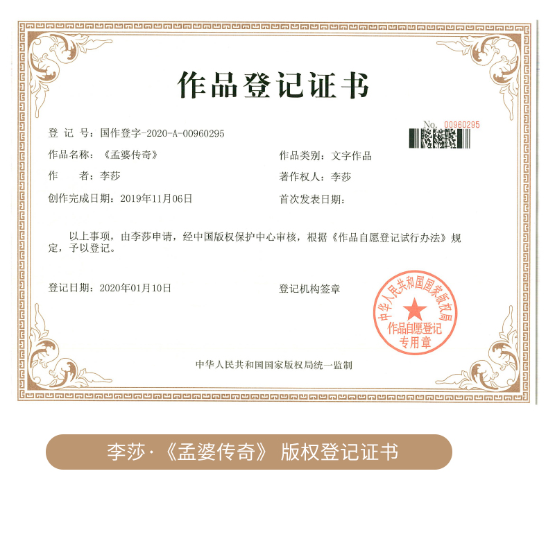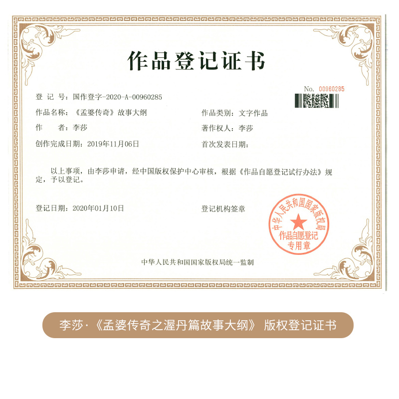 希达文化向来都重视作品版权的保护,而这些作品作为李莎老师的经典之作,并于2020年1月10日登记,经中国版权保护中心审核,其文字作品《孟婆传奇》、《<孟婆传奇>故事大纲》获得了国家版权局颁发的《作品登记证书》,登记号分别为:国作登字-2020-A-00960295、国作登字-2020-A-00960285。美术作品《孟婆渥丹》也获得国家版权局颁发的《作品登记证书》,登记号为:国作登字-2020-F-00960271。