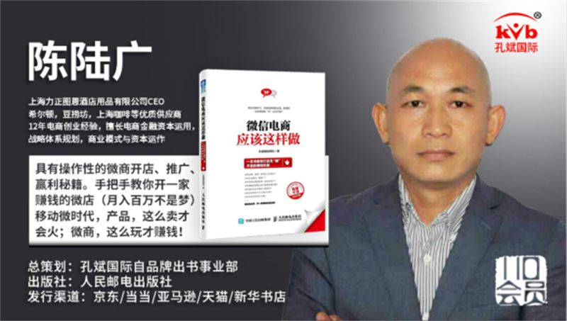 陈陆广老师经营着上海图恩酒店用品公司,长期为希尔顿、豆捞坊、上海咖啡等大品牌企业稳定供货。之所以获得大品牌的青睐,除了陈陆广先生企业产品的品质保证外,还与陈陆广先生13年来积累形成的电商创业经验、电商金融资本融合策略、电商战略体系规划、电商经营模式和资本运作方式等成熟的商业技巧分不开。本着回馈社会,推动微信电商行业规范化、高效率运营的初衷,陈陆广先生与孔斌国际下属的出书大师网合作推出了《微信电商应该这样做》一书,短短数月便引起了微信电商届的强烈反响,该书在京东、当当、天猫、亚马逊和新华书店全渠道热销,长期处于供不应求的境地。