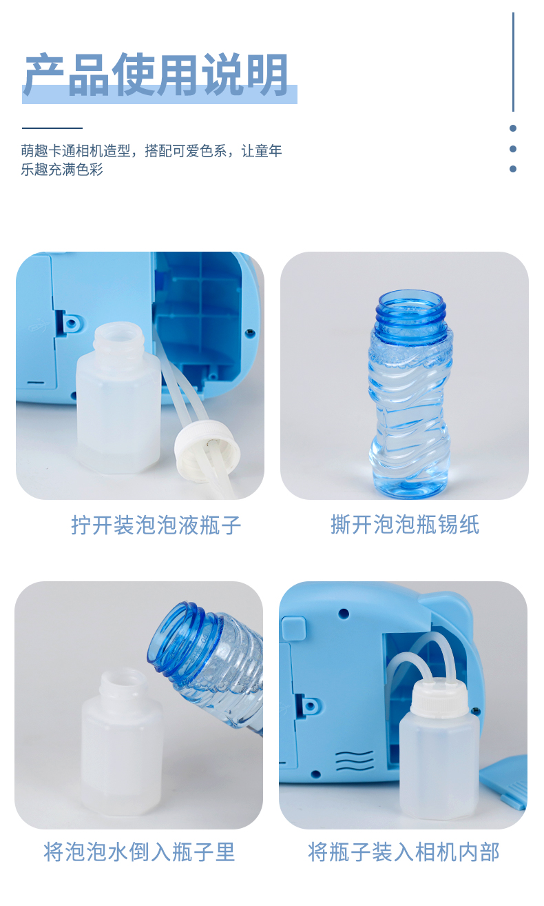 泡泡机的安装非常简单,打开泡泡水仓,将泡泡水放入拧紧。打开电池盖,放进3节5号电池,1分钟不到就能搞定。