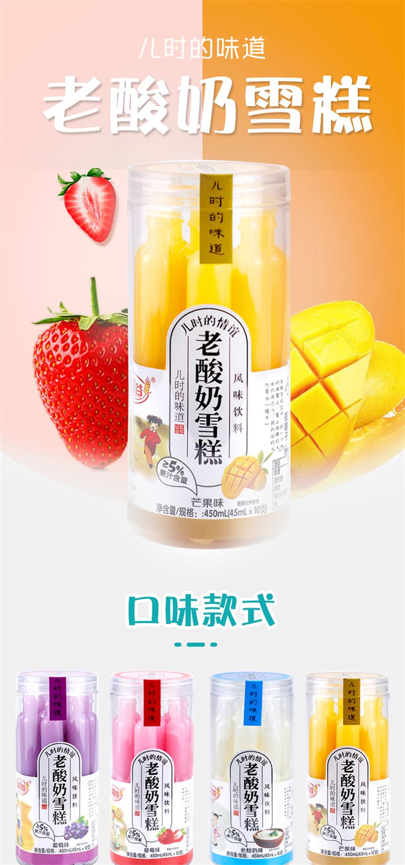 金稻谷老酸奶雪糕按哈根达斯雪糕的配料+益力多的酸奶配料+饮料、雪糕相结合的特殊做法,做出来的冰棒是会流动的酸奶雪糕饮品。它里面添加的果汁含量>5%,所以果味非常浓郁。